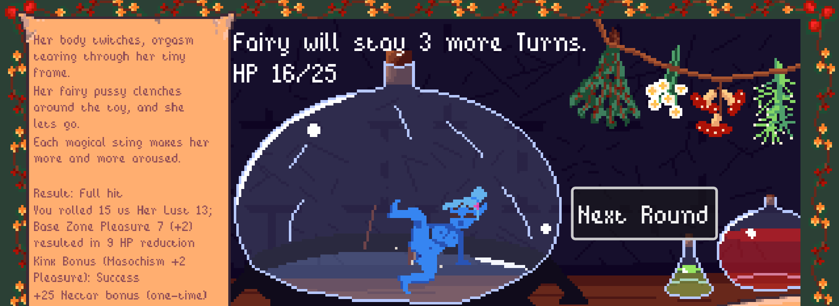 I've finished working on the new interaction system. Now you get to choose how to play with the Fairy to squeeze as much Nectar as Possible! It is a complex RPG-style system, that involves Lust (Accuracy), Pleasure (damage), HP and much more... Just look how happy you can make her: